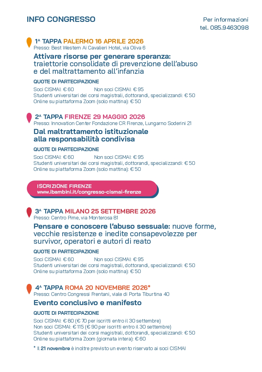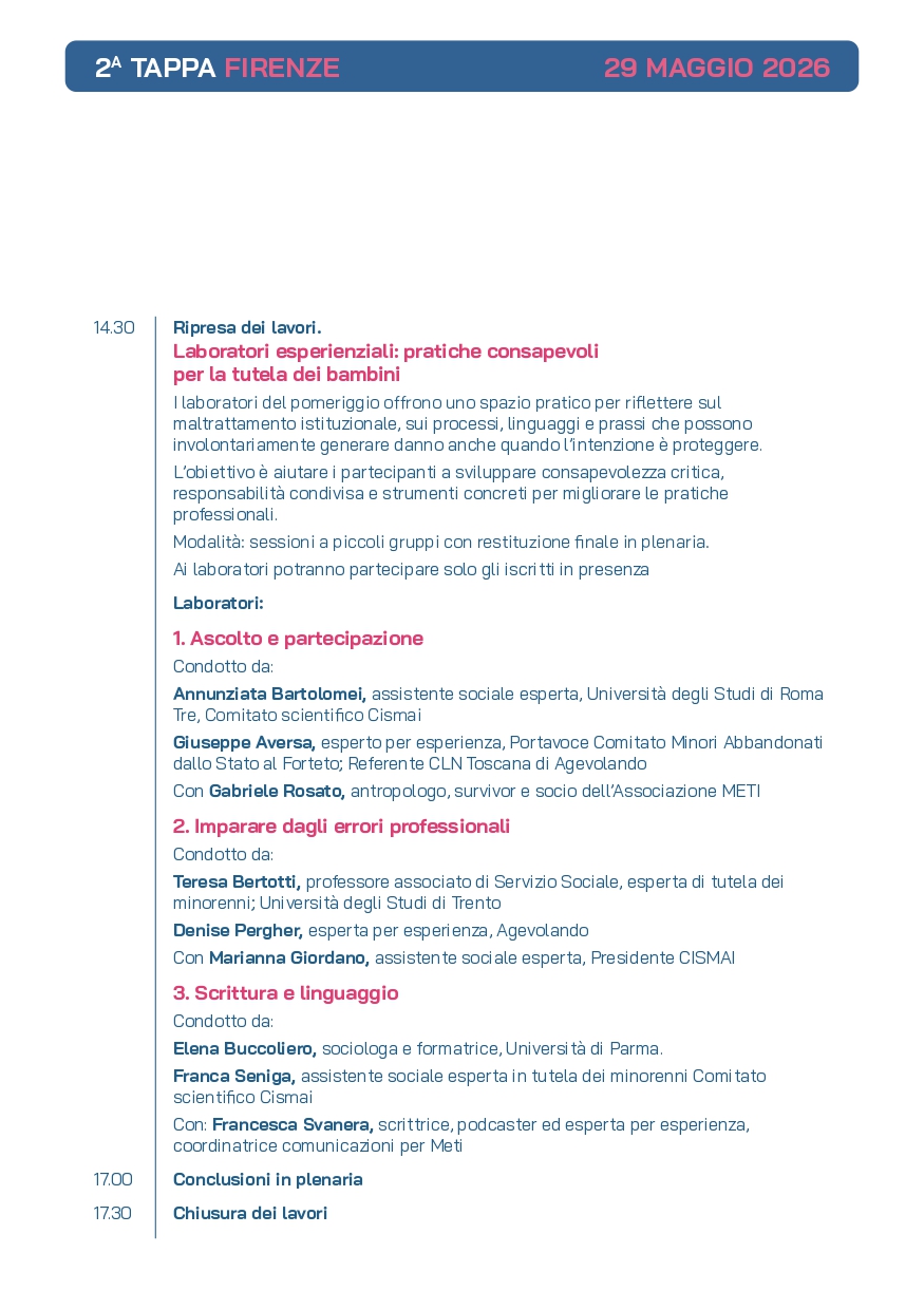 I laboratori del pomeriggio offrono uno spazio pratico per riflettere sul maltrattamento istituzionale, sui processi, linguaggi e prassi che possono involontariamente generare danno anche quando l’intenzione è proteggere. L’obiettivo è aiutare i partecipanti a sviluppare consapevolezza critica, responsabilità condivisa e strumenti concreti per migliorare le pratiche professionali. Modalità: sessioni a piccoli gruppi con restituzione finale in plenaria. Ai laboratori potranno partecipare solo gli iscritti in presenza.